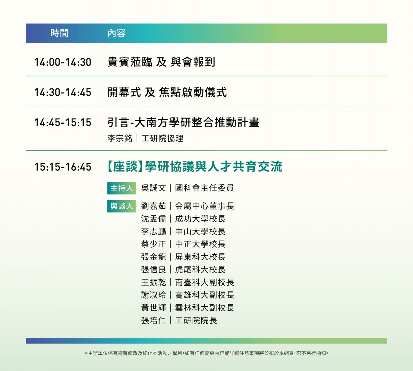 本論壇匯聚中央部會、南部大學與科研法人,推動南部科研整合與人才共育新模式,聚焦跨校協作、學生培育機制與政策連結。活動強調資源共享、科研合作與人才培育的實際作法,促進南臺灣學研發展與青年職涯成長,帶動大南方科研平台持續深化與擴展。