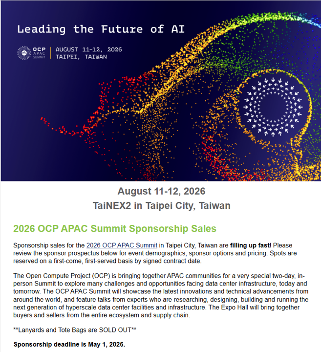 代轉公告2026 OCP APAC Summit 贊助方案,相關資訊請參考下方說明,若有任何疑問,請直接聯繫活動窗口。